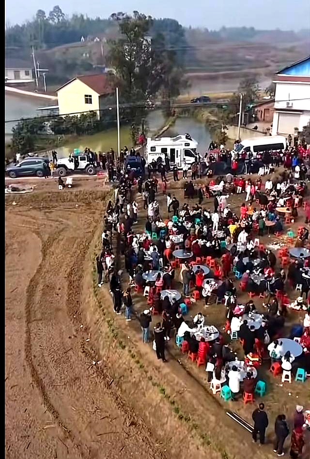 她爸妈没喘气的工夫,院坝摆了流水席,纸碗一摞摞,骨头堆在蓝色塑料桶边。
