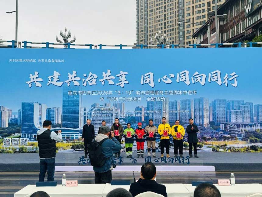 活动现场,钟涛在致辞中回顾了2025年巴南区城市治理取得的丰硕成果,全区完成200万平方米“土坡菜地”整治改造,新增城市绿地100余万平方米,建成10个口袋公园;新增停车位2.3万余个,设置11处规范化临时摊区,建成120余个户外劳动者服务站点;依托社会参评员、城市观察员及一线工人组成的“移动探头”队伍,发现处置城市治理问题9000余个,处置率达98.49%,宜居宜业的城市环境持续优化,共建共治共享的治理格局不断深化。同时,钟涛表示,2026年巴南区将坚持系统观念、下足绣花功夫,重点打好洁净城市立体战、秩序规范阵地战、设施焕新攻坚战、品质添彩升级战、文明润城持久战“五大战役”,精耕城市管理“绣花功夫”,并呼吁广大市民积极参与城市治理,共同守护美好家园。
