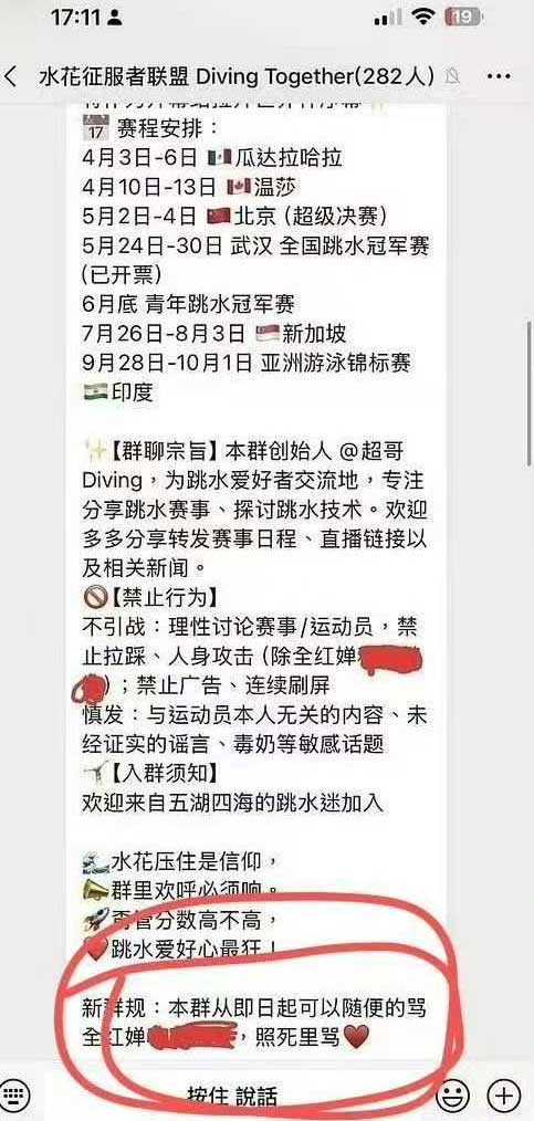 这群“自己人”,藏得远比我们想象中更深,里面有疑似跳水队的相关从业者,有长期跟进跳水赛事的自媒体,有一些自称熟悉圈内情况的人,甚至还有网传消息称,有现役队员的身边人潜伏其中。