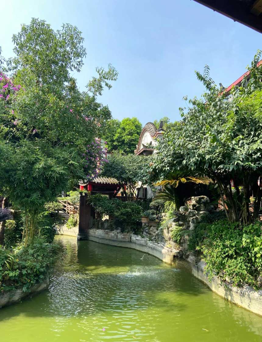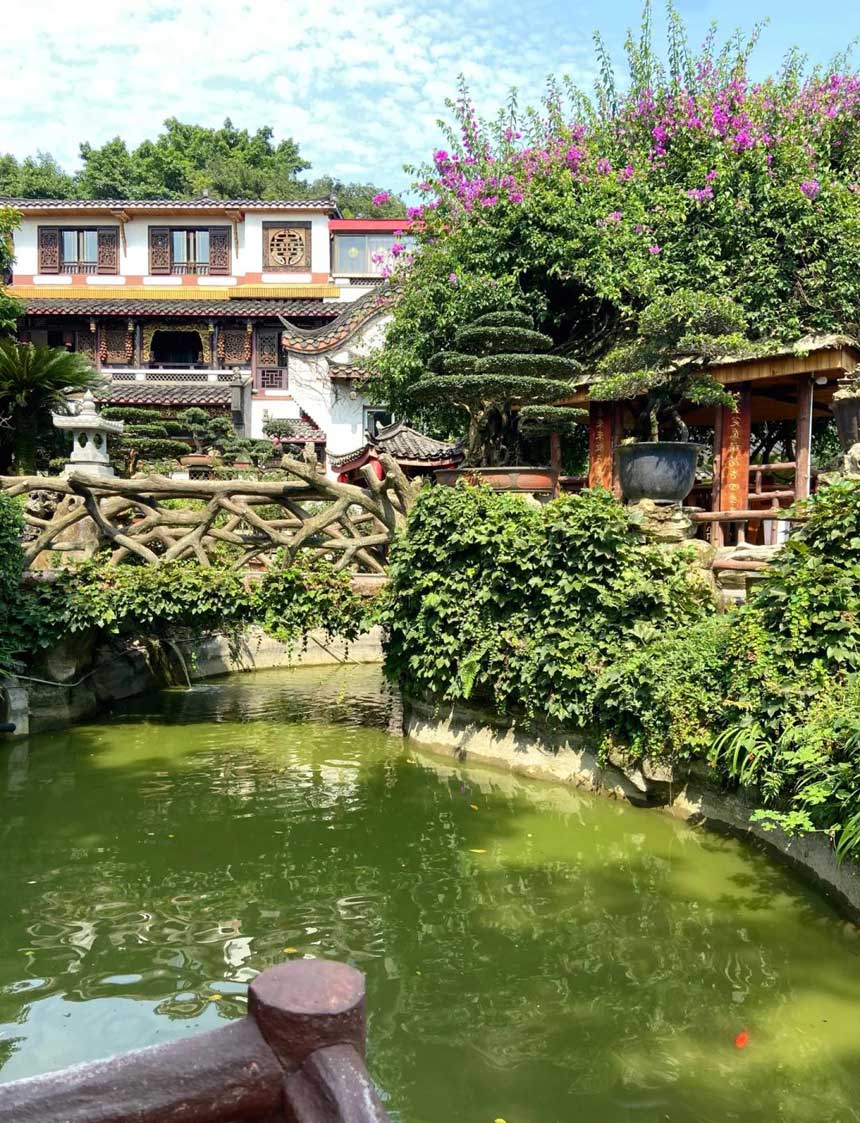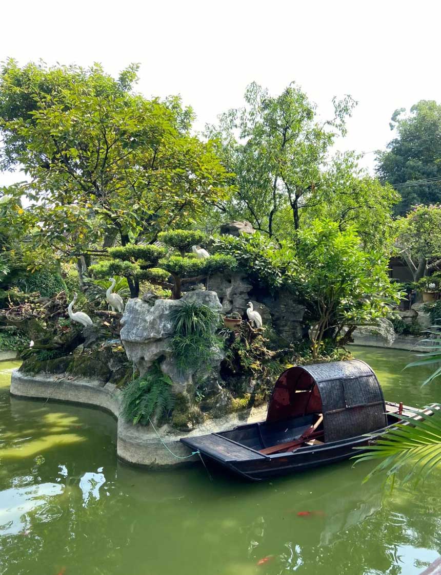 园林设计仿效苏州园林风格,占地广阔,曲径通幽,内有盆景、石刻、木雕、古玩字画、明清家具等元素,营造出古色古香的氛围。
