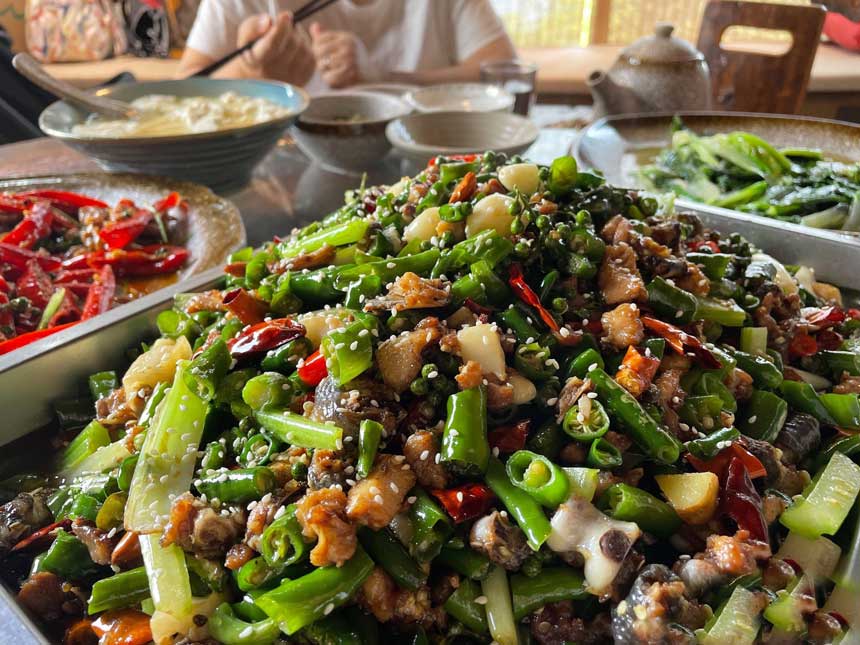 两生花民宿环境很好,与农家乐有点类似,从功能分区规划、院落的打造上能看出老板是很用心的,一边是喝茶聊天,一边是用餐; [服务铃]服务:老板很热情,服务也很周到;附近停车也很方便; [米饭]口味:菜品很新鲜,性价比非常高,特别是萝卜大骨汤,我的妈呀,四根筒子骨……在山下哪家店会这么舍得!点赞!汤锅、烤肉一并解决,很不错