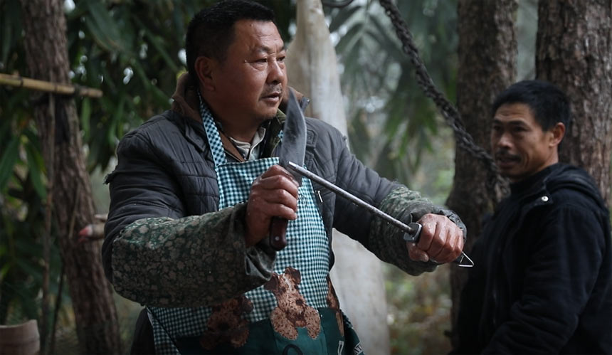 经过一番努力,那头肥硕的猪终于被安稳地按在板凳上。此刻,杀猪匠的精湛技艺即将展现。在他面前,摆放着一个精致的小瓷盆,专门用来承接猪血。为了确保自家食用的猪血品质上乘,接血的过程也颇有一番讲究:盆中需先撒入少许细盐,这样不仅能使接下的猪血更为纯净,还能加速其凝固。随后,再加入凉水,并不断搅拌,直至猪血充分稀释且均匀。