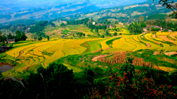 田埂高低错落、层层叠叠,从山脚攀至云端。其线条行云流水,潇洒柔畅;其规模磅礴壮观,气势恢宏。