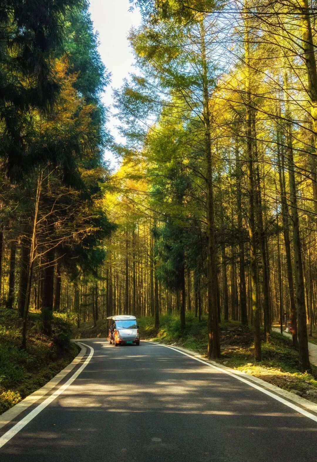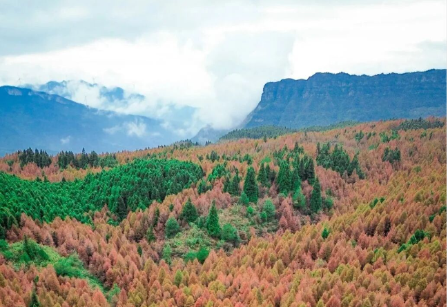 10月底至11月底景区内的上万亩水杉与柳杉形成奇特的景观分界一侧的水杉林在秋霜浸染下变成金黄璀璨另一侧的柳杉林则依旧保持着盛夏的翠绿一条公路贯穿其中宛如“季节分割线”造就了“一半春天一半秋天”的奇幻画面