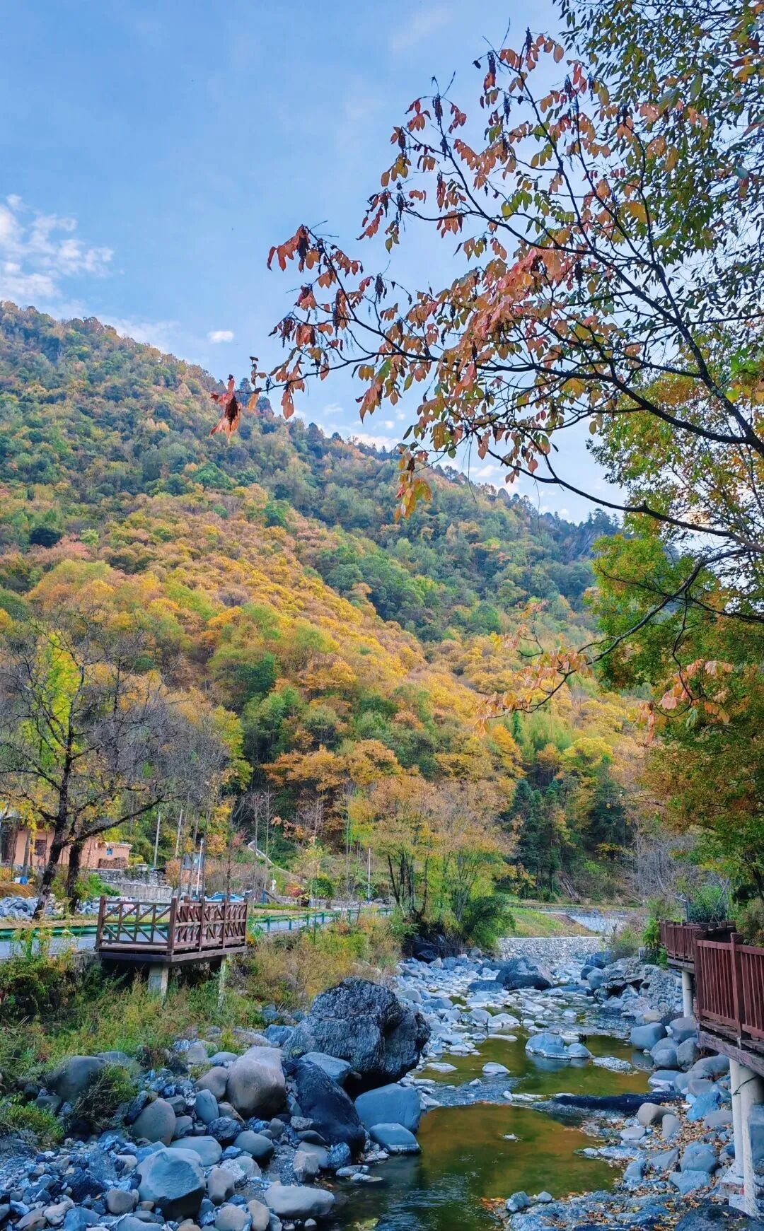 这里与乌江同框山水相依,风光旖旎仿佛是一幅流动的山水画卷可尽情漫步于林木之间看红枫轻舞,赏红黄交织