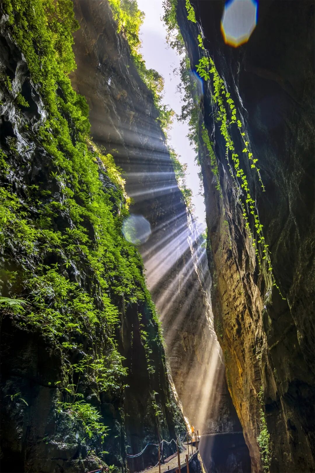 著名景观· 青天峡地缝:入选《中国国家地理》重庆100个"最美观景拍摄点"之一.全长1500米,平均深度300米以上,深达600米,极窄处不足2米,是地貌与亿万年地壳运动共同作用的结果.谷底怪石嶙峋,溪流淙淙,可体验“一米阳光”奇观.