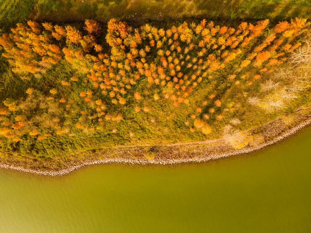 成片的水杉挺拔直立,深绿与金黄交错,阳光穿透枝叶,在湖面投下斑驳的光影;火红的叶片在蓝天下格外耀眼,仿佛点燃了整个湖畔。