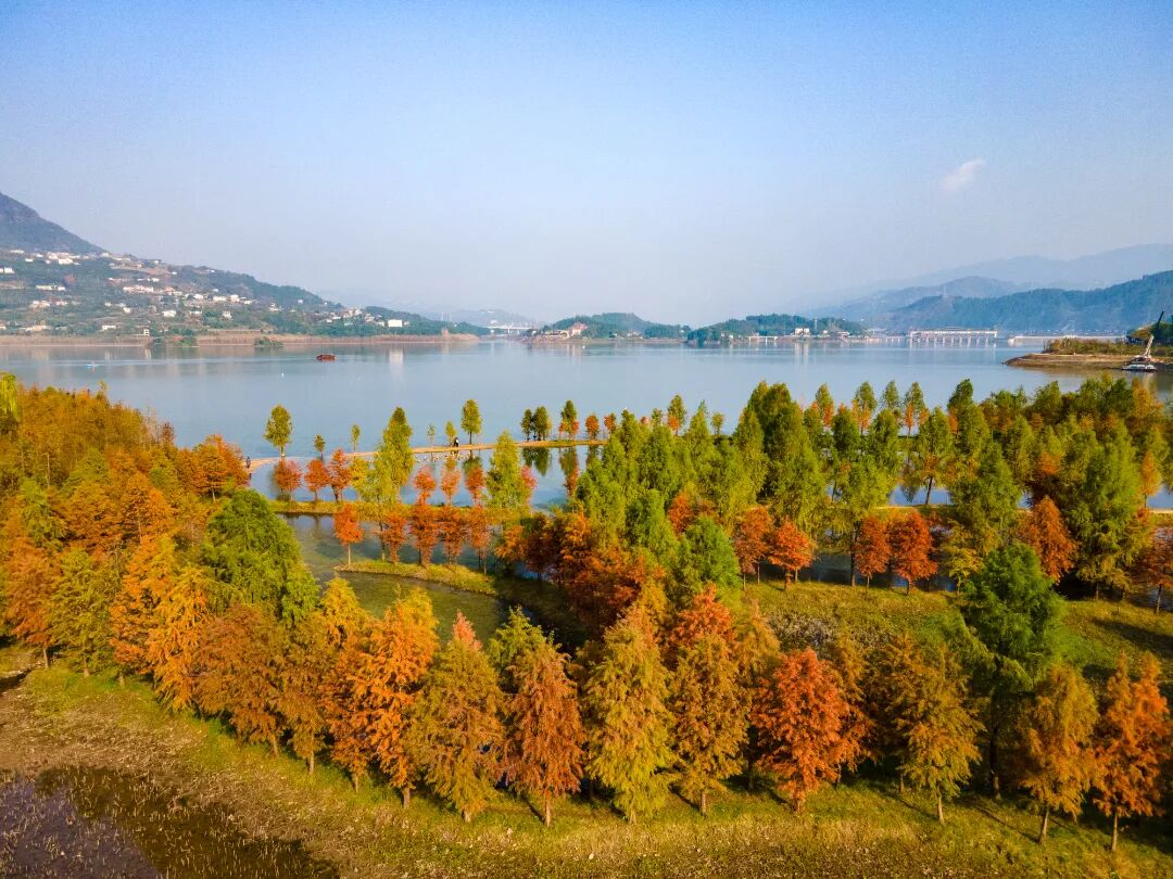 当秋意漫过三峡库区的丘陵,开州汉丰湖便成了大自然打翻的调色盘。漫山遍野的乌桕、枫香、水杉褪去葱茏,换上金黄、火红、橙红的盛装,沿湖岸铺展成绵延数十里的彩林画卷,邀着每一位爱秋的人,来赴这场湖光染秋的约会。