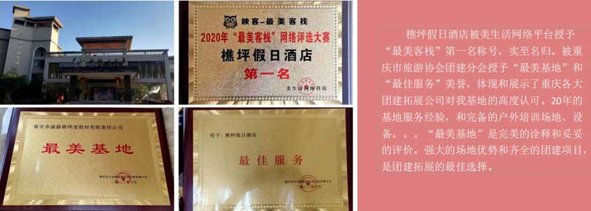 樵坪假日酒店被美生活网络平台授予“最美客栈”第一名称号,实至名归。被重庆市旅游协会团建分会授予“最美基地”和“最佳服务”美誉,体现和展示了重庆各大团建拓展公司对我基地的高度认可。20年的基地服务经验,和完备的户外培训场地、设备。。。“最美基地”是完美的诠释和妥妥的评价。强大的场地优势和齐全的团建项目,是团建拓展的最佳选择。