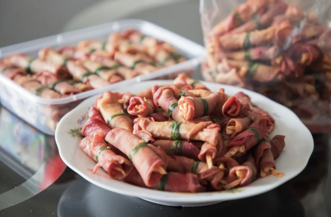 青草坝萝卜卷 合川区龙市镇青草坝出产的沙罐萝卜,个大皮薄,颜色鲜艳,萝卜肉白嫩、汁水浓、味道甜,还可做水果解馋。青草坝萝卜卷的制作技艺在青坝村已经传承了200 余年,为重庆市非物质文化遗产代表性项目。其味鲜美,有麻、辣、鲜、香、脆、甘等特点,不仅是家居餐桌上的一道佳肴,也是旅行途中的一味可口小吃。