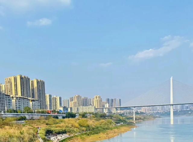 在冬日暖阳的照射下 湛蓝的江面 有种“海边即视感” 湛蓝的天空中 飘着几朵轻柔的棉花糖白云 景色美到让人心醉