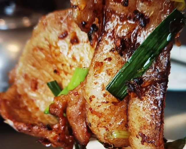 带着体温的猪肝,需第一时间下锅,与土坛泡椒猛火急炒,瞬间锁住滑嫩的口感和原始的香气;最见功夫的,是那盘蒜苗回锅肉。肥瘦相间的二刀肉整块煮熟,晾至微凉切成薄片。热锅下肉片,慢慢煸炒至油脂渗出、边缘卷曲,形成诱人的“灯盏窝”,再撒入一大把本地蒜苗,浓郁的肉香与辛辣的蒜香便扑面而来,成为桌上扎实的硬菜之一。