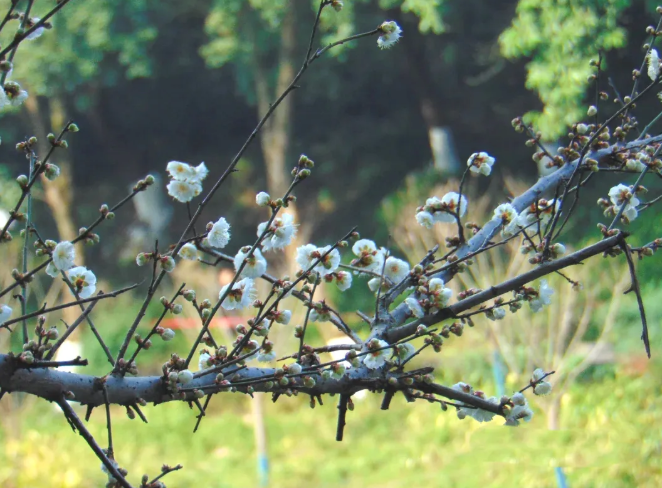 偶尔穿插几树白梅 清雅得像落在枝头的雪 阳光一照,晶莹透亮~ 风一吹,花瓣簌簌飘下来 地上仿佛铺了一层“梅花地毯”
