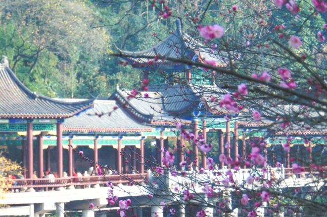 几个古典风格的亭子 也常常被对岸的一两枝梅花“点缀” 黑瓦、红柱、粉白的花 当阳光洒下 花影与亭子交错 构成一幅构图精巧的水墨画