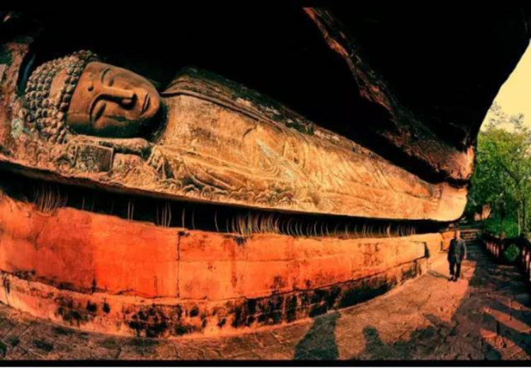景点四:悬空卧佛钓鱼城悬空卧佛系创作于晚唐时期的一尊巨型石刻佛像就一尊悬空的崖壁凿成身长11米,肩宽2.2米头为高肉髻,两耳间距1.8米着双领下垂袈裟赤足,双脚宽1.2米它背北面南,头西脚东袒胸露肌,面形丰满端庄慈祥,情态自然是一幅构图严谨,比例匀称既有大刀阔斧、雄伟壮观又有精雕细琢、娓娓动人的摩崖造像