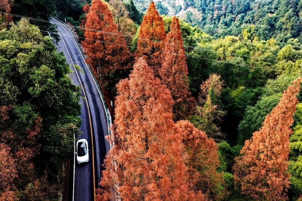 沿着蜿蜒山路徐行 两旁色彩扑面而来 一簇簇水杉挺立如烧透的火炬 枫叶在光中透出粉金渐变 深深浅浅、明明暗暗 原本常绿的山林 被这些彩叶温柔“点染” 像是大自然在这里藏了一卷 只属于冬日的秘绘本