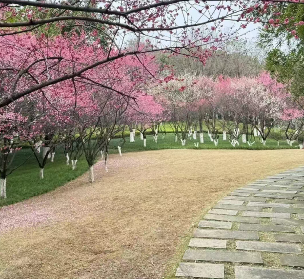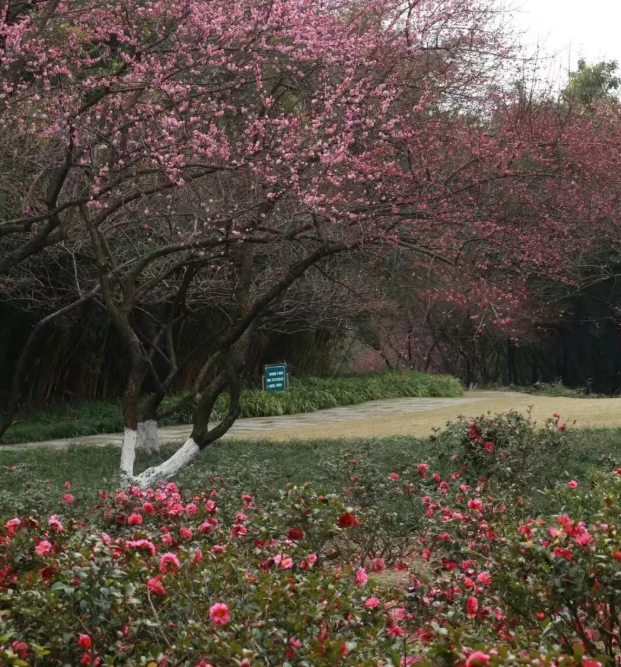 公园东侧入口附近即有红梅点缀,可先浅尝辄止。沿主干道向西漫步,寻找成片集中的梅林,花朵如云霞般“氤氲开来”,公园内还栽植有玉兰、海棠、樱花、茶花、杜鹃等三十余种花木。到开阔草坪区可稍作休息,回望来路,红梅与其他春花、绿树共同构成层次丰富的春日画卷。