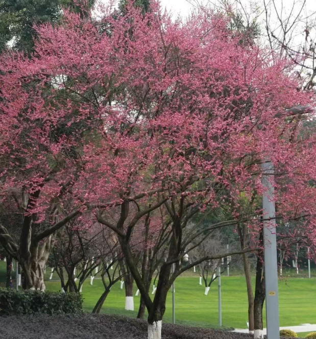 开阔草坪边缘:以广阔的草坪和天空为背景,拍摄红梅树的完整形态,画面简洁大气。