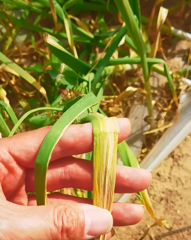 第七个就是药害问题。药害也是会引起大蒜黄叶的。大蒜出苗前很多菜友为了防止杂草生长,会直接过量的使用一些除草剂,那就会造大蒜的叶片生长受到了抑制,失绿发黄,出现干尖黄叶的现象。有一点需要提醒一下大家,就是大蒜出苗之后发生黄叶,大多数基本上都是生理性黄叶,你可以提前用海藻酸加氨酰酯去预防就可以了,别矫枉过正了。