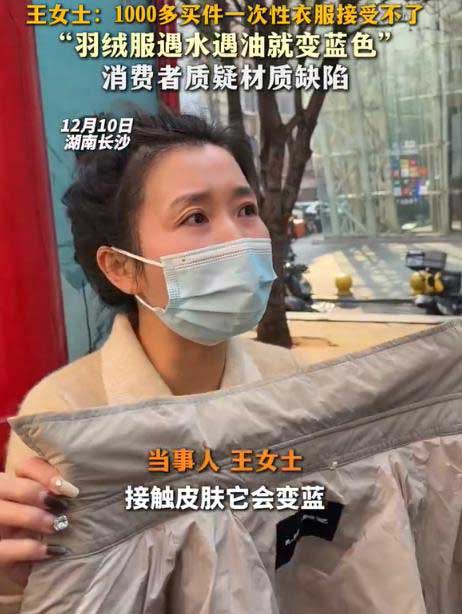 事件中争议焦点在于面料特性。王女士强调日常穿着未接触明显油污,但衣物却出现夸张吸油现象。类似情况并非个例,某社交平台上有消费者反映同品牌羽绒服遇水遇油即变蓝色。专业人士指出,部分轻薄羽绒服为追求“泡芙”般蓬松感,采用高密度锦纶面料,这种材质虽轻盈却易吸附油脂,且污渍渗透后难以局部清洁。品牌方虽已换货,但未对材质缺陷质疑作出具体说明。