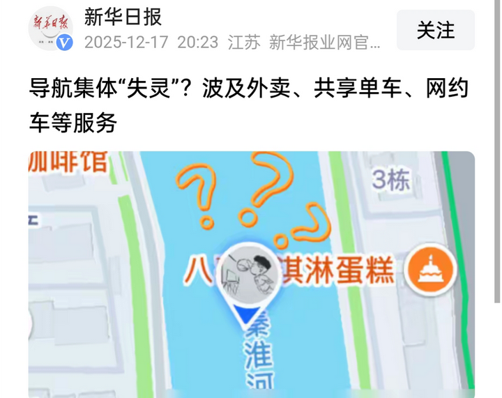 2025年12月17日傍晚,南京城区上演了一场“全城找不着北”的荒诞戏码——高德、百度、苹果地图集体“罢工”。不少网友在网络上吐槽导航定位一会儿飘去玄武湖,一会儿瞬移到57公里外的句容;外卖骑手对着空白导航原地打转,共享单车用户关锁时发现自己“穿越”到了邻市,网约车司机接单本市业务,其路程显示居然达1.8万公里。还有网友吐槽“人在河西喝咖啡,定位显示在汤山泡温泉”。