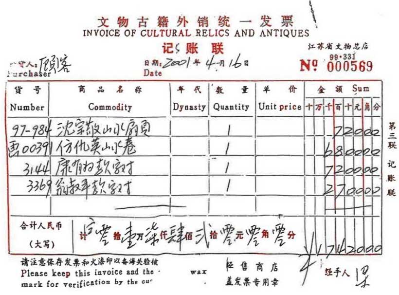 南博那边为了证明自己合规,拿出来一堆票据,上面写着他们在2001年4月16日,把一幅叫《仿仇英山水卷》的画,作价6800块钱卖给了江苏省文物总店。