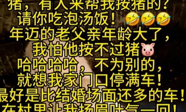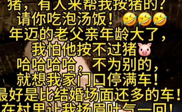 “爸爸年纪大了,杀猪怕按不住,谁要是能来帮忙,干完活请大家吃刨猪汤,想把家门口的路停满车,比结婚还热闹。”