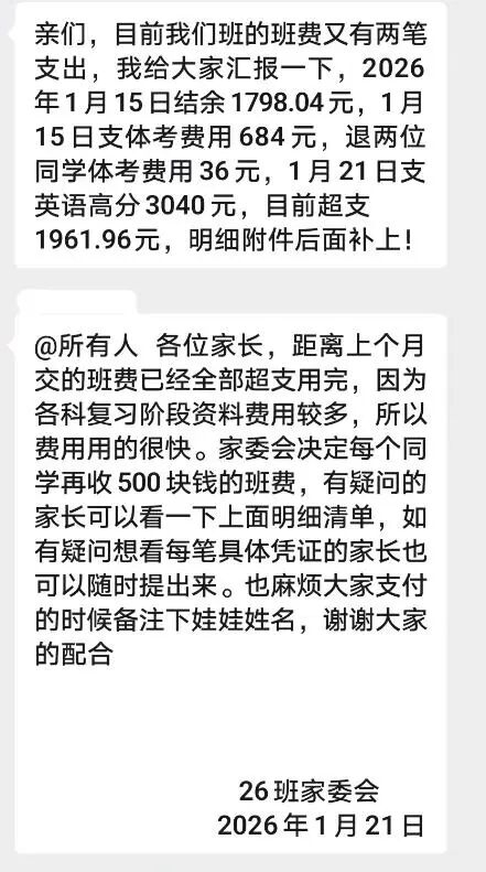 2025年10月14日,该家委会在微信群里称,“从上学期到现在,班费还剩756.77元,考虑到娃娃们初三了,班级开支和各种资料用到的费用会更多,现在的班费已经完全不能支付下次的费用,现家委会决定向每位同学收取500元班费。”