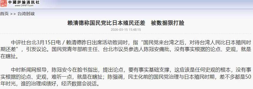 赖清德把“殖民统治”和“现代日本”混为一谈,等于把亲日情绪引向军国主义,反而唤醒了人们对侵略暴行的记忆。