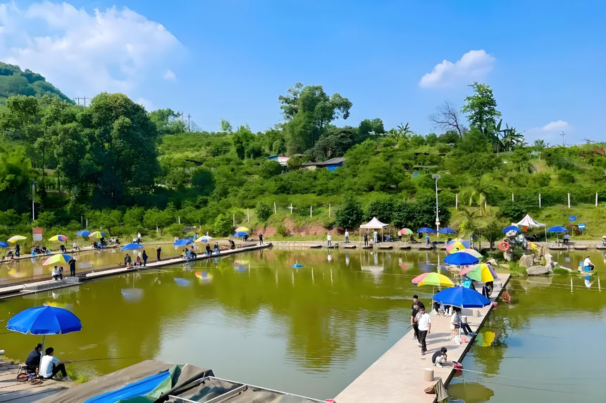 康然山庄的鱼塘水是从长江抽上来的,塘中喂养了鲫鱼、桂鱼、鲢鱼等多个品类,鱼的生长环境和野生相似,所以口感特别好。不少老顾客享受完垂钓之乐,会把亲手钓来的鲜鱼在山庄进行加工,和亲人朋友一同享受乡间美味,还会购买一些村民种植的蔬菜水果带回去送给亲戚朋友品尝。