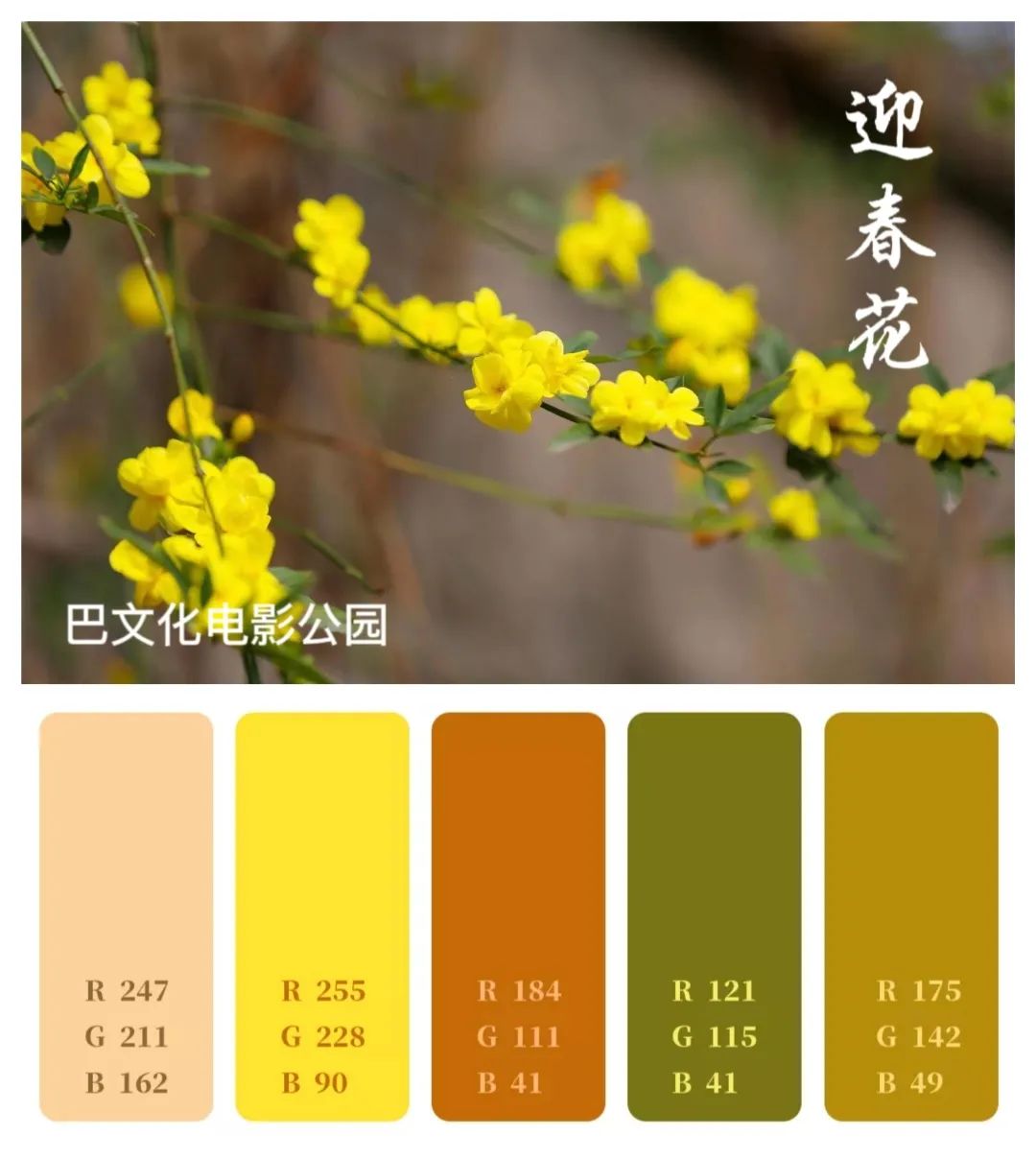 仲春时节 鲜花正盛桃花红、杏花白、油菜花黄……一起用色卡方式打开巴南绝美春天吧~ 高楼晓见一花开 便觉春光四面来在巴文化电影公园里迎春花顺着枝条绽放淡淡的清...