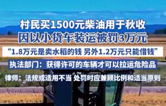 村民买1500元柴油用于秋收,因以小货车装运被罚3万元,执法部门:获得许可的车辆才可以拉运危险品