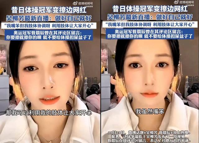 近日,前中国女子体操队队员吴柳芳因发布多条性感热舞视频,被另一位前中国女子体操队运动员管晨辰留言批评,引起广泛关注。此前报道,吴柳芳视频账号因违反社区规定已被禁止关注。 11月2...