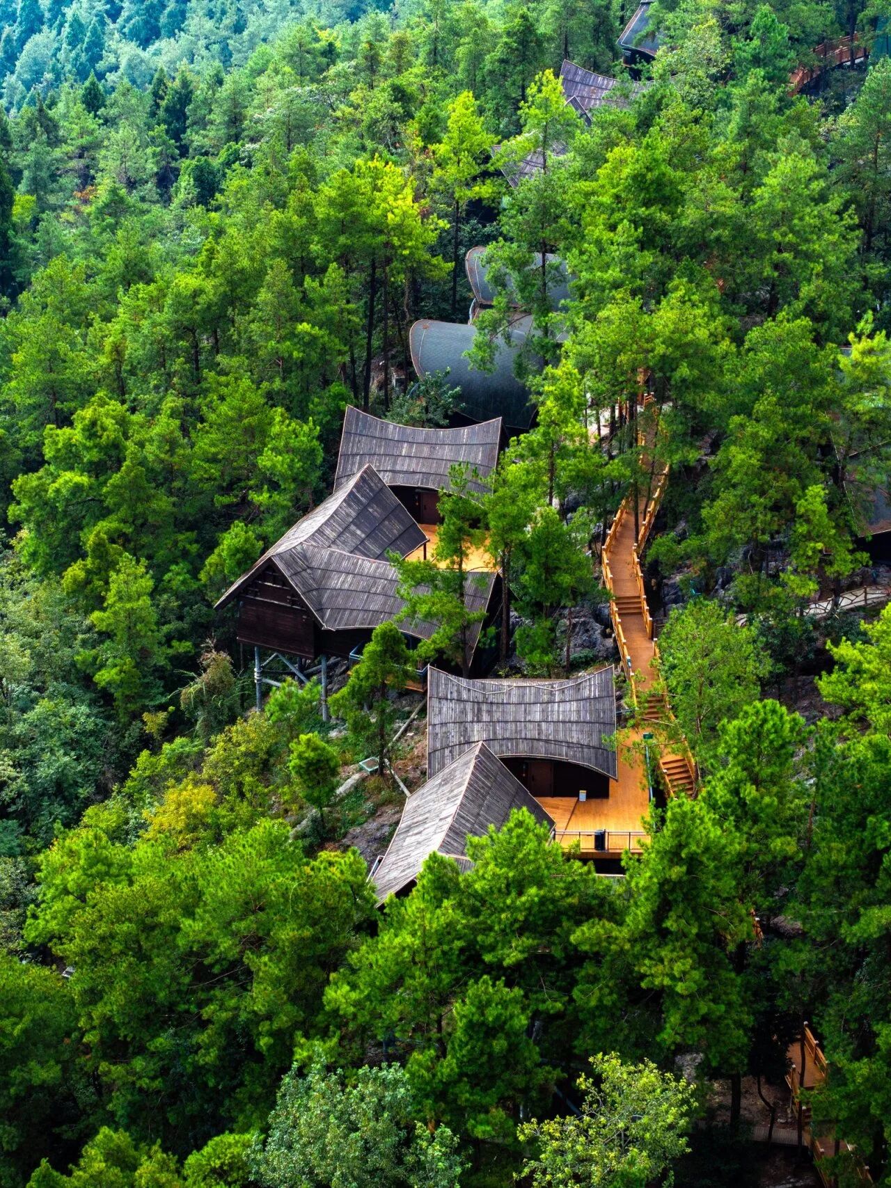 桃花源森林酒店坐落于苍翠林木之间推窗即见远山叠嶂 云烟缭绕伴鸟语虫鸣入眠 随晨光雾霭醒来享受一段隐逸于世的静谧时光