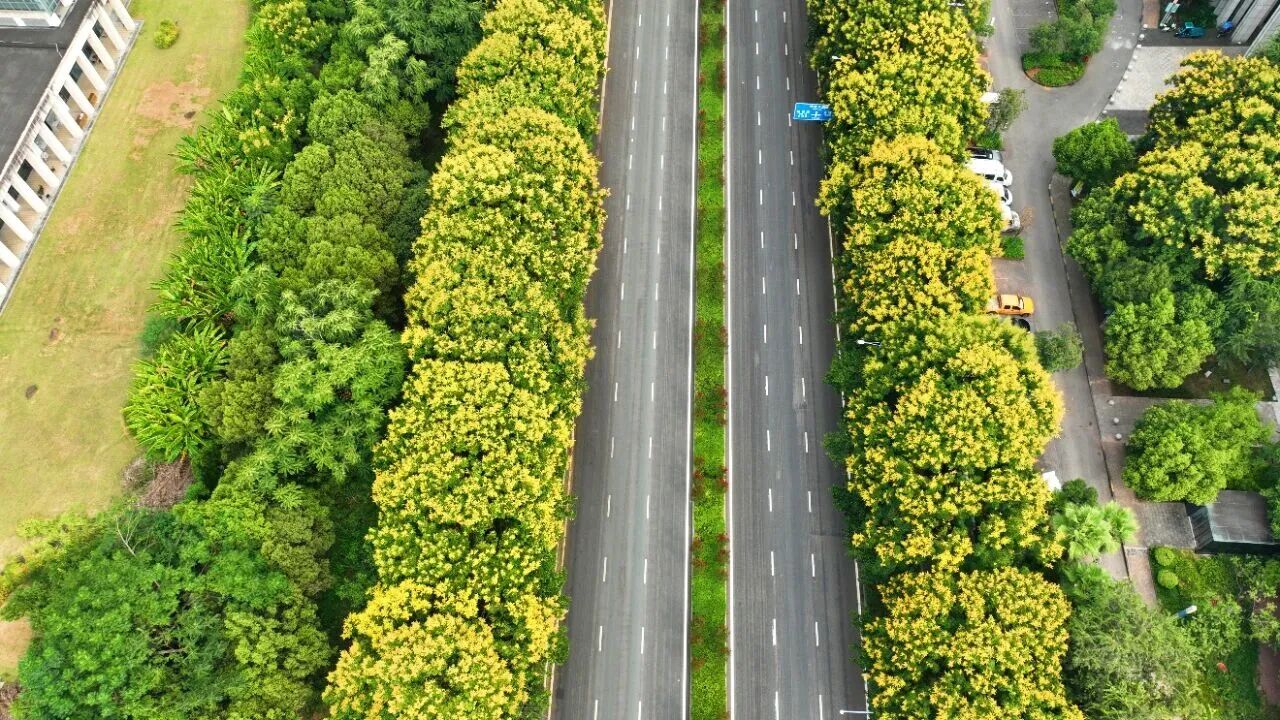 水土街道方正大道两侧密密麻麻排列着的小黄花延绵近2公里粉红的蒴果缀在枝头,宛如小灯笼
