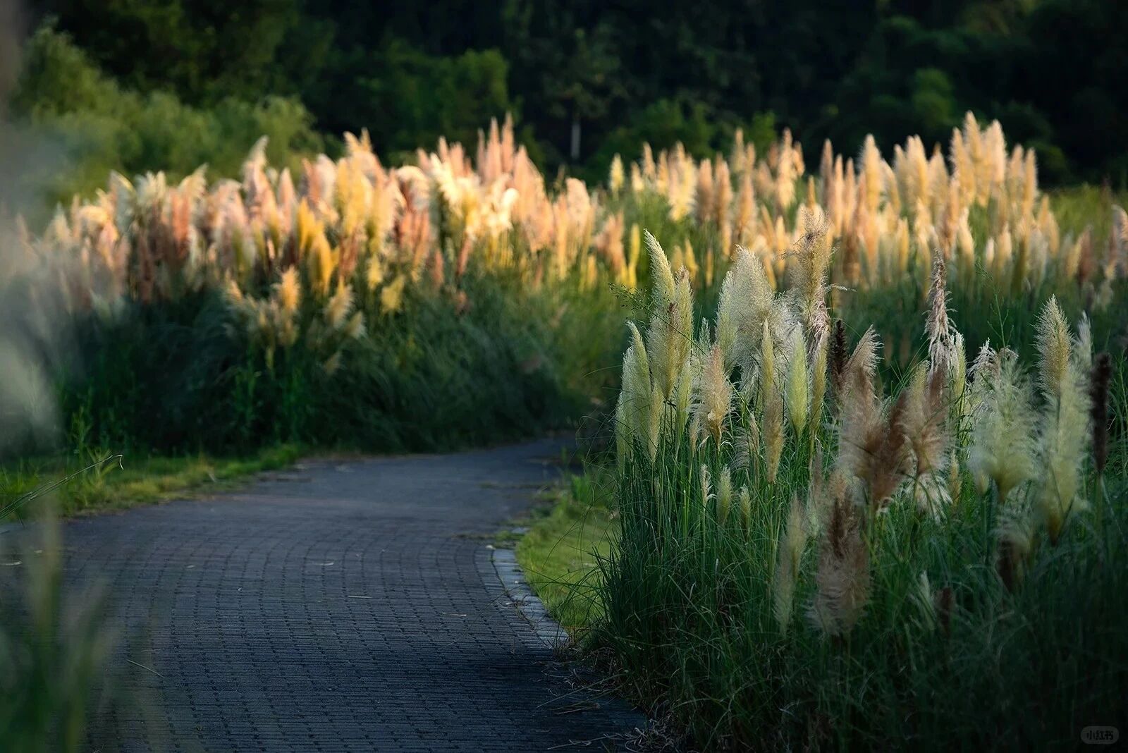 北碚竹溪河公园里一丛丛闪亮的蒲苇随风摇曳夕阳洒下柔和金光,宛如一片波浪