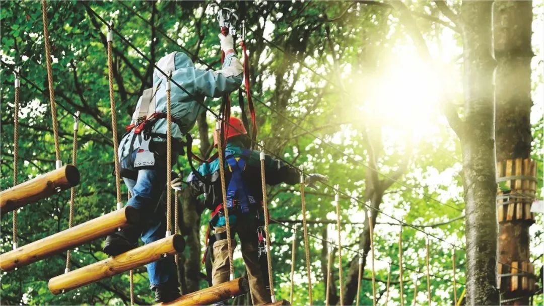 晨起,到近500亩的山地星空露营公园开启活力一天,打卡摇摆桥,在纸片岩石凹造型,坐高空秋千俯瞰山林。