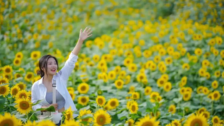转身即踏入另一重时空 齐肩高的金色向日葵 组成巨型“阳光矩阵” 向日葵又名“太阳花” 因其花盘会随着太阳转动而得名