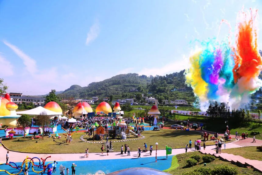 抵达板辽金沙滩,这里是国内最具特色的内陆沙滩。金色的沙滩、蓝色的游泳池与热带植被交错搭配,这个国庆让你不出重庆也能感受海岛风情,拍照、玩沙、水上活动一应俱全!