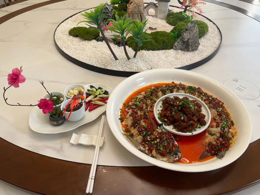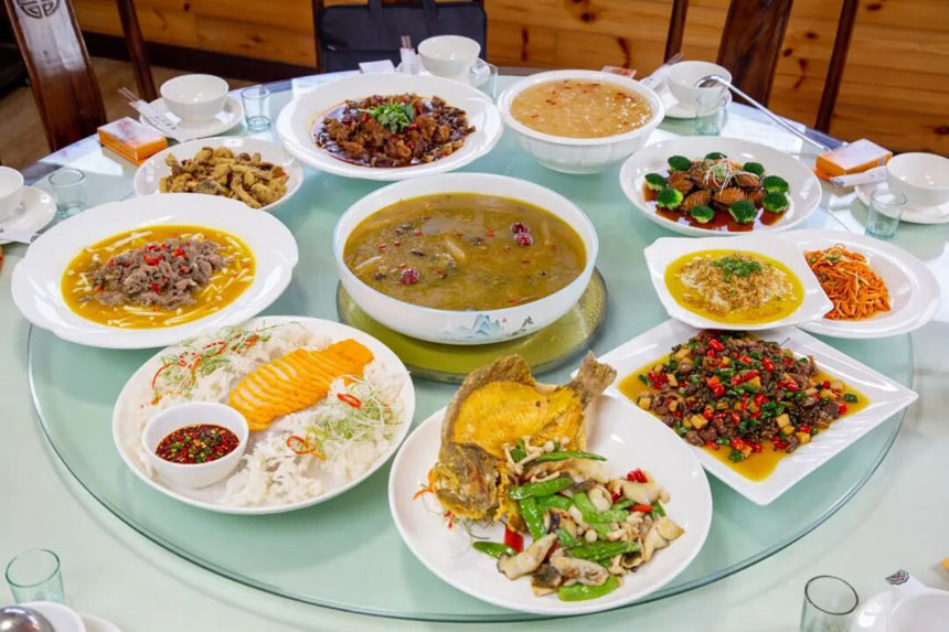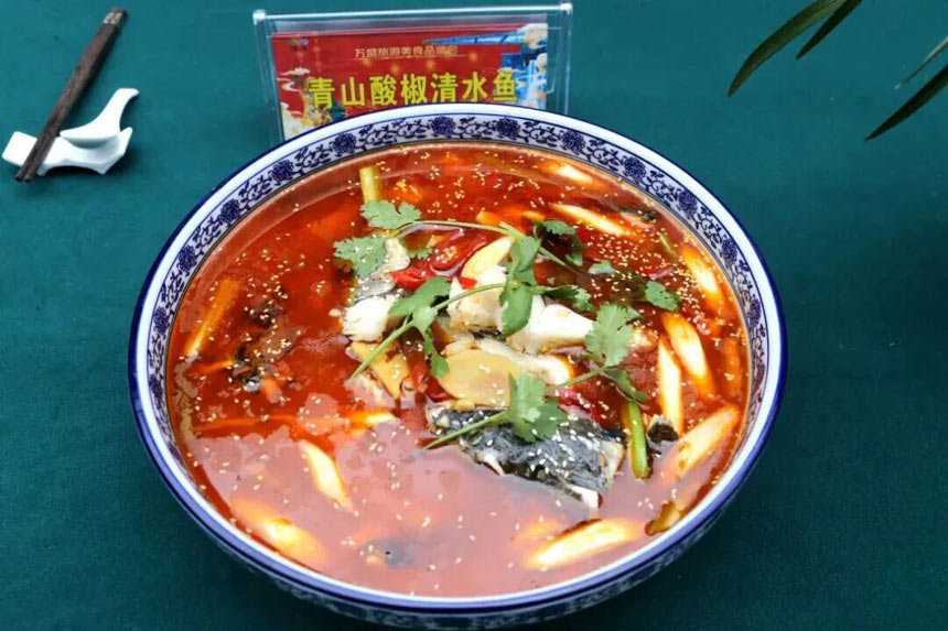 捕捞青山湖养殖鱼,通过传统技艺烹饪鱼肉鲜香、辣味适中、酸味四溢,刺激着味蕾恨不得拌上白米饭再来一碗。