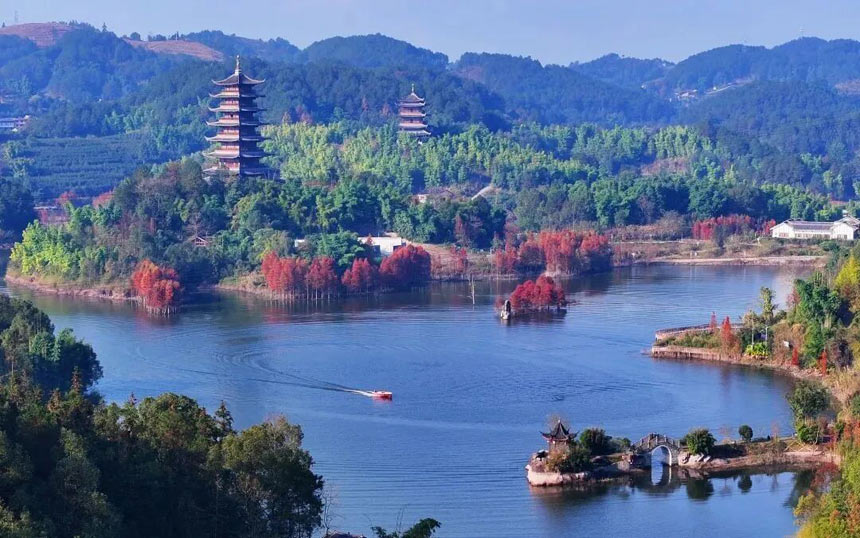 这里四面青山环抱,碧波荡漾,半岛和岛屿星罗棋布。沿着环湖健身步道漫步,欣赏美丽的湿地风光和壮观的滴水岩瀑布。