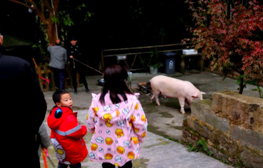 五斗丘小院,这个隐藏在山林之间的地方,见证了无数杀猪时的热烈场面。那天,雷鸣般的欢呼与地动的热闹,让人仿佛置身于一场狂欢之中。为了亲历这一盛事,许多怀揣好奇心的朋友们选择在五斗丘民宿安顿下来。清晨,当山里的浓雾尚未散尽,四合院中的孩子们已经迫不及待地相互串门,召唤小伙伴们一同跑出院子,跟随师傅的脚步去追逐那头即将成为美食的猪。