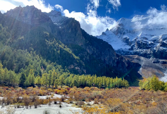 如今四姑娘山换上了五彩斑斓的外衣,和童话世界一样唯美。远处白雪皑皑,近处彩林遍野,构成一幅绝美的金秋画卷。