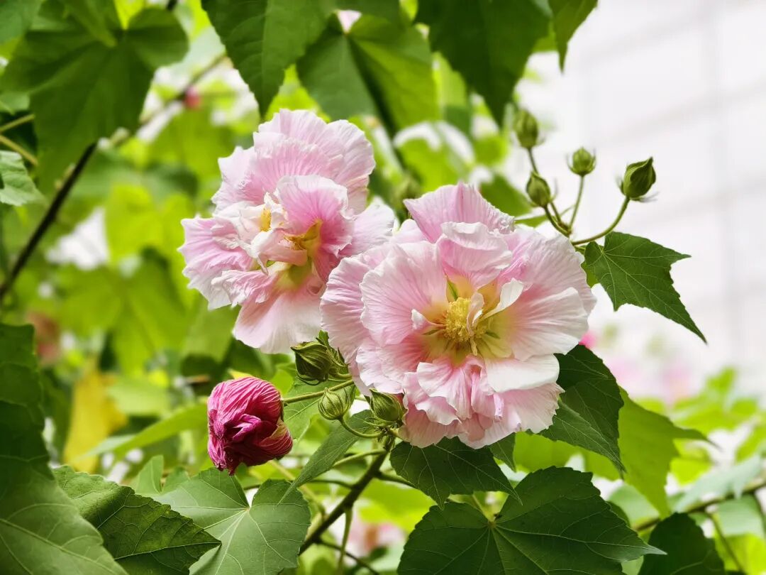 在这片免费开放的城市秘境里芙蓉花沿河岸肆意生长野趣十足清晨花苞缓缓绽放花瓣通透如白玉午后阳光渐暖花瓣又像被染上了胭脂傍晚时分又摇身一变醉成迷人的深红如夕阳下燃烧的红霞美得令人心动