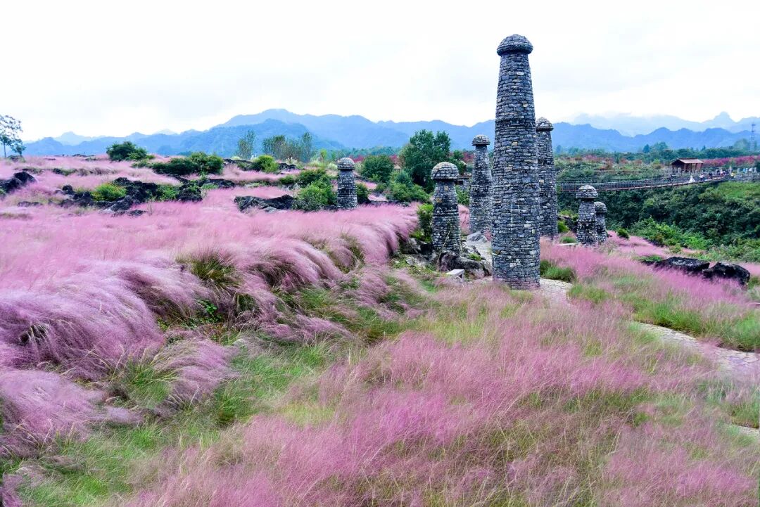 酉阳叠石花谷景区以“寒武叠层石”闻名。内有粉黛乱子草千余亩,秋季形成浪漫粉色花海。