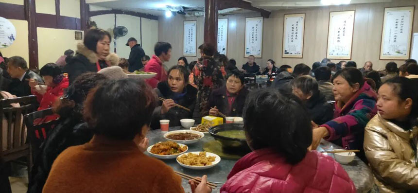 祈福仪式完成 我们的刨猪汤也上桌啦 现炸酥肉、泡椒血旺、爆炒猪肝 红烧肥肠、萝卜排骨汤、刨猪汤...... 吃“嘎嘎”分“年货”了哟!