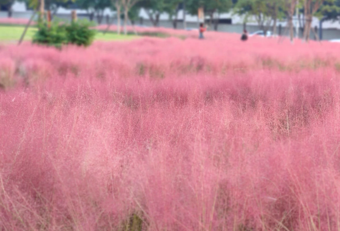 鹿山公园的粉黛乱子草开好了!粉紫色花穗如发丝从基部长出如红色云雾铺开一大片这是一个生态型山地景观公园5.8公里车行道骑行超惬意也还很适合露营在公园西北侧树林中的草坪上搭帐篷、天幕,可以待上大半天