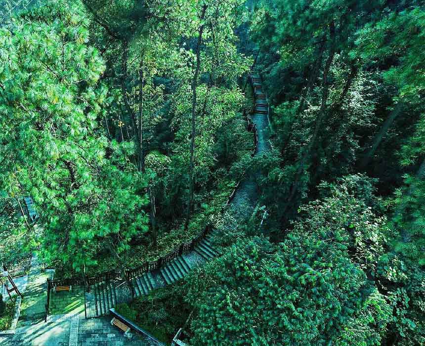 当然 你也可以沿着建文步道徒步上山 南温泉的森林资源极其丰富 森林覆盖率达95% 建文步道总长3.83公里 沿途林木参天 松涛阵阵 是重庆难得的优质健身步道