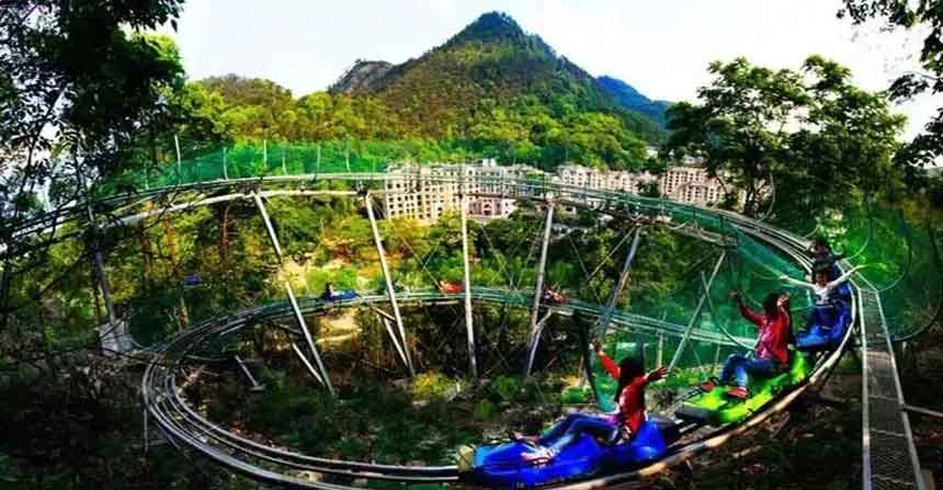 下山时乘坐滑道 全长2280米 从海拔500左右的高度滑下来 全方位接近大自然 360°感受山与天 感受速度与刺激