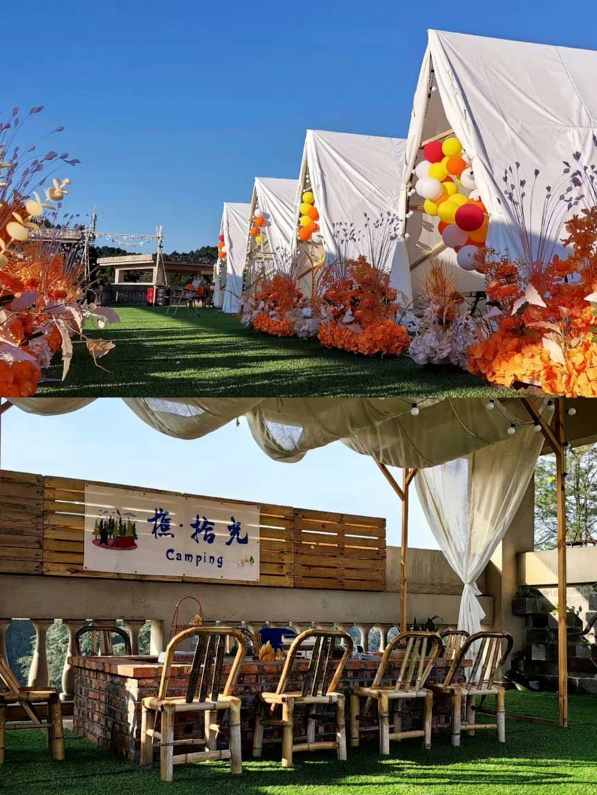 ①、围炉煮茶:绿色的大草坪,木质的桌椅,古朴的茶具,多人围坐,享受围炉煮茶的乐趣。
